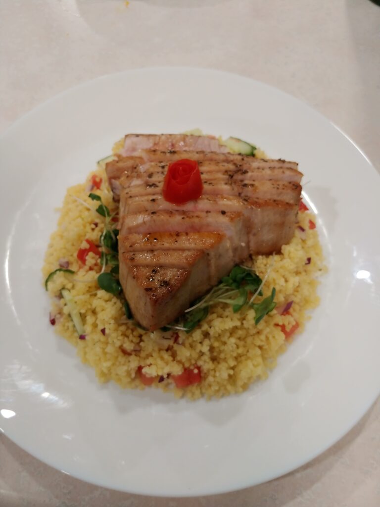 A quick and easy lunch. Couscous was cooked in a lemon juice mixture, flash chilled and the tossed with cucumber, feta, tomato and onion. Micro greens and a little tomatoe rose garnish. Nice and appealing.