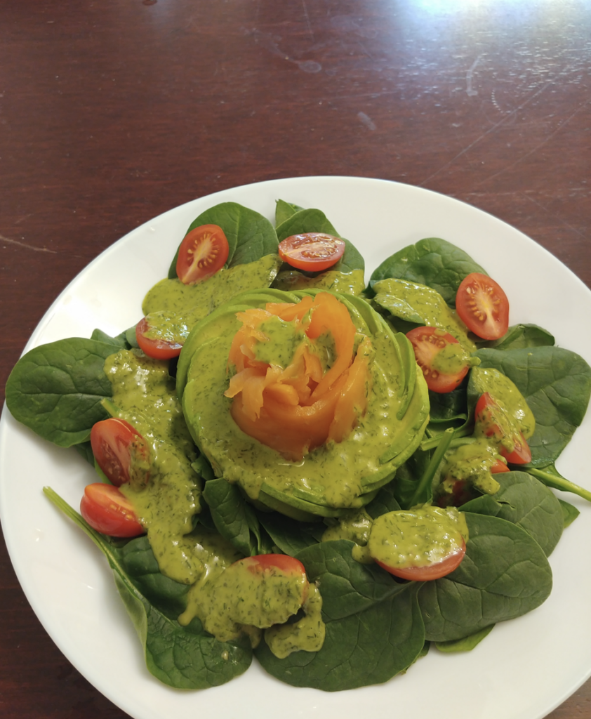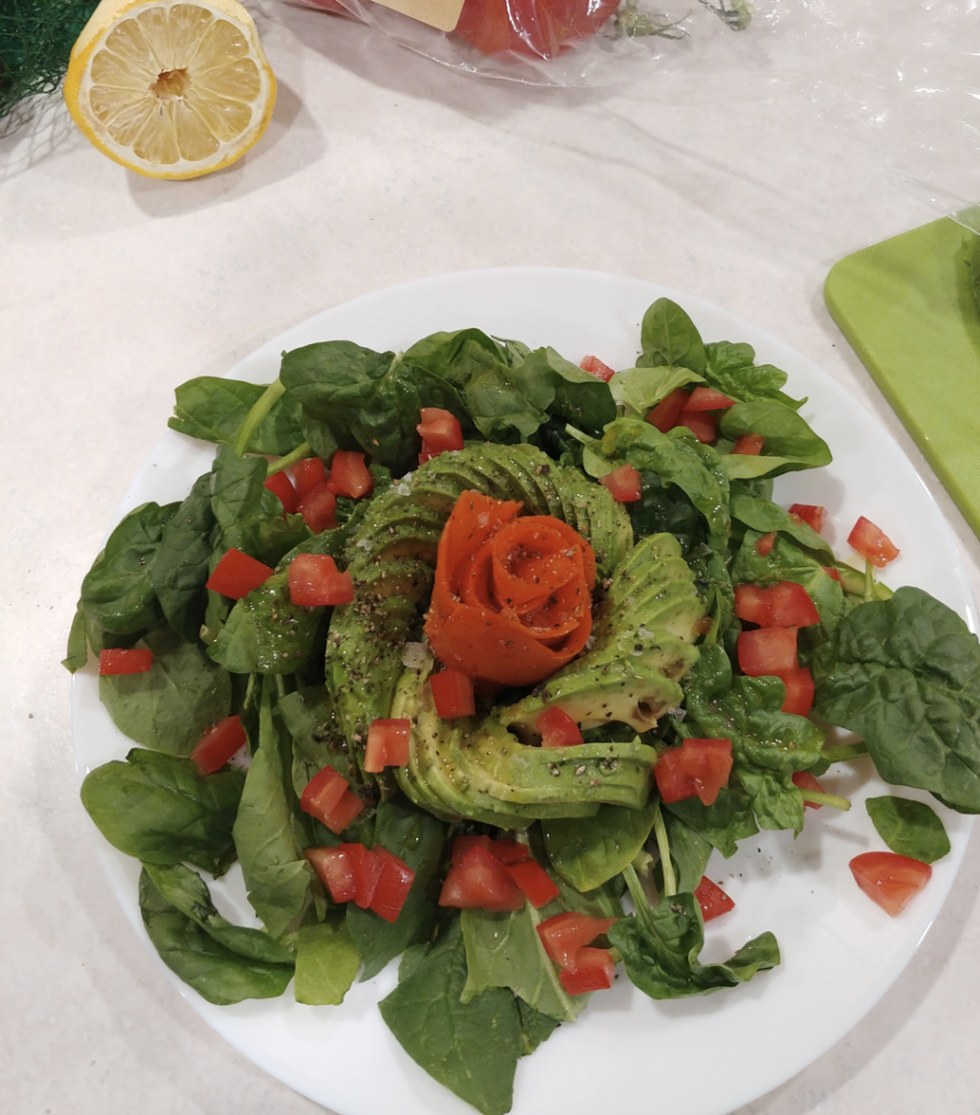 Just a plain spinach base, ring of avocado and then tomatoes sprinkled around. 2 variations are whether to use a tomato peel as the “rose” in the centre which then matches the color or to go a bit more decadent and use a smoked salmon rose. If using smoked salmon a garlic/dill dressing is a must. If struggling with making the rose place in freezer for a bit so it stiffens up and is easier to work with.