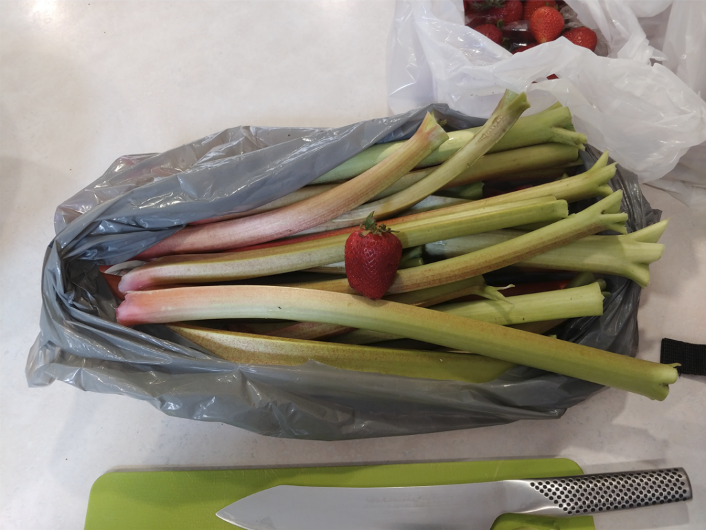 I have 3 large rhubarb bushes in my garden and inevitably end up with too much rhubarb on my hands. After passing some off to family/friends I use the rest up either in pie or in a delicious compote. I don’t use any particular recipe just usually eyeball half half rhubarb to strawberry and adjust based on taste afterwards.