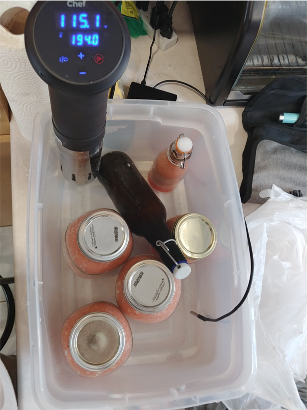 I will not get too deep into thermal death kinetics (but its a great topic for another time). But for pasteurization time and temperature matter most. I can use high temperature for a short time or lower temperature for a longer time. For this case I pasteurized at 90c for 1 hour (plus the startup time). I setup my sous vid for 194F (90c) and a probe along side it and put in my bottles and jars to be pasteurized (picture bellow). In industry I have used Datapaq at few different jobs to confirm the time at temperature which is critical to process and was able to emulate that with my own probe & logger. I was able to confirm exactly 1 hr at 90c and almost 2 hours at 80c which proves sufficient for pasteurization.