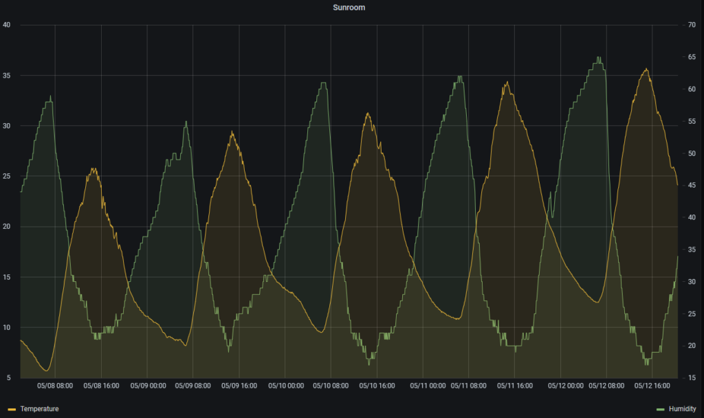 I monitor temperature and humidity in my sunroom. An interesting trend can be seen when overlapping humidity and temperature. As the sunroom is an uncontrolled environment when temperature increases during the day humidity drops down but at night when temperature comes back down humidity comes back up.
