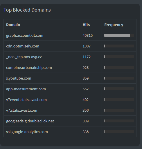 Follow up on my previous post https://adam-s.ca/cell-phone-tracking-pihole/. The top blocked domain by an exceedingly large margin was graph.accountkit.com. After a bit of research turns out that that this is facebook’s tracking api, and that facebook messenger was the key culprit in this over usage.