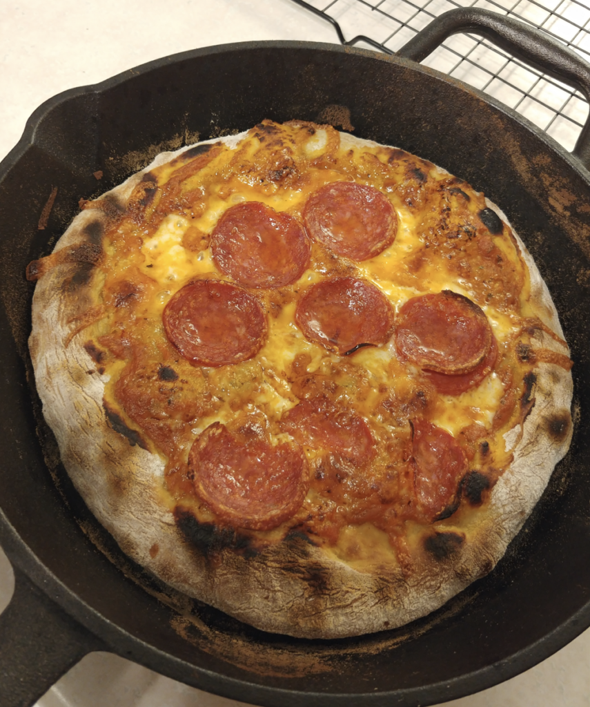 Before buying my pizza steel I would make pizza in a preheated cast iron pan. Preheating to 450F for ~45min allows me to get a great bottom as well as a beautiful charred top.