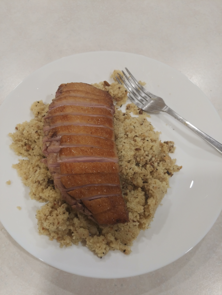 Though I could have done a bit better on presentation, duck breast is a personal favourite of mine and it tasted great. I placed this over a nice mushroom couscous and the only thing missing was a nice sauce and vegetable side. Pre-slicing the breast made for perfect mouth sized pieces. Next time I will expand on this dish but for now its a quick and easy meal.