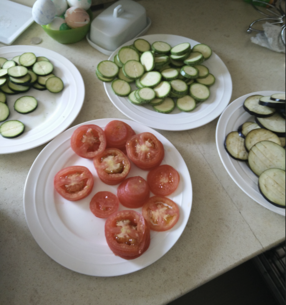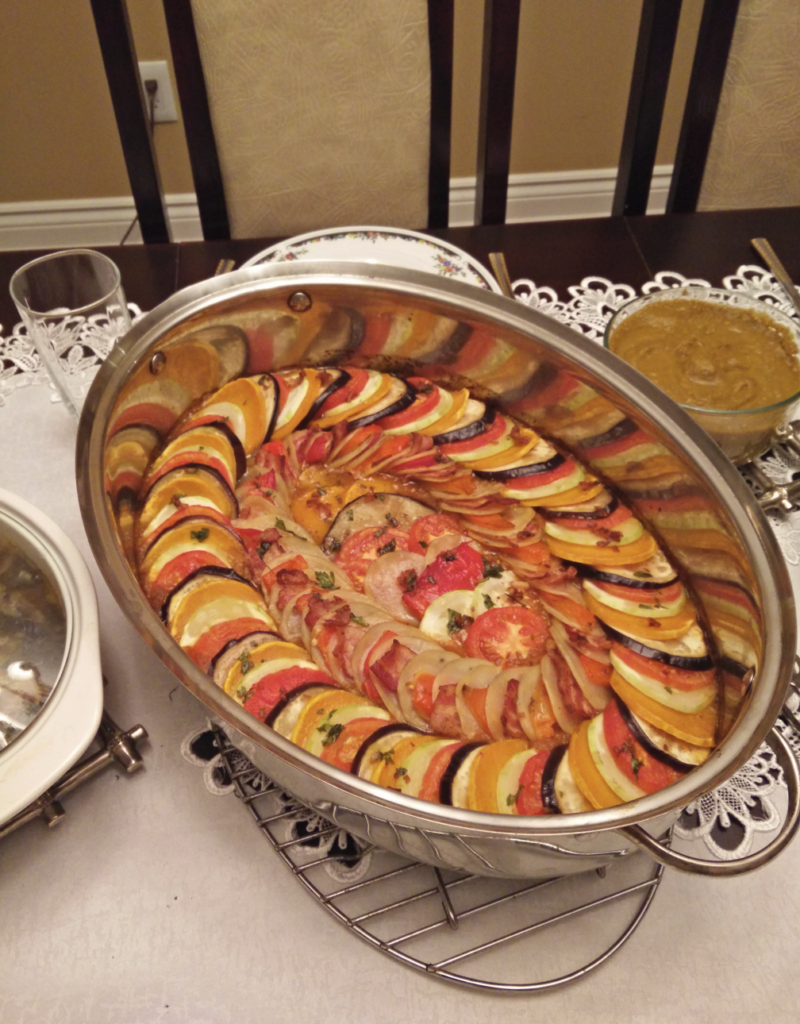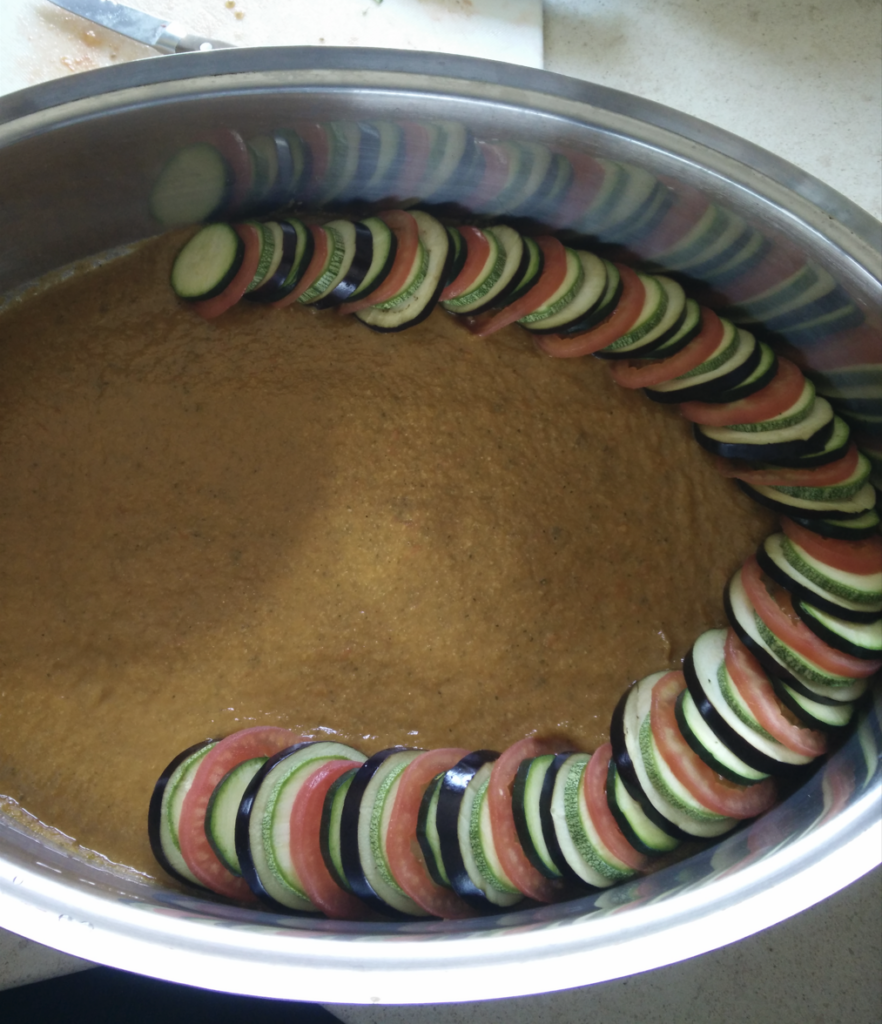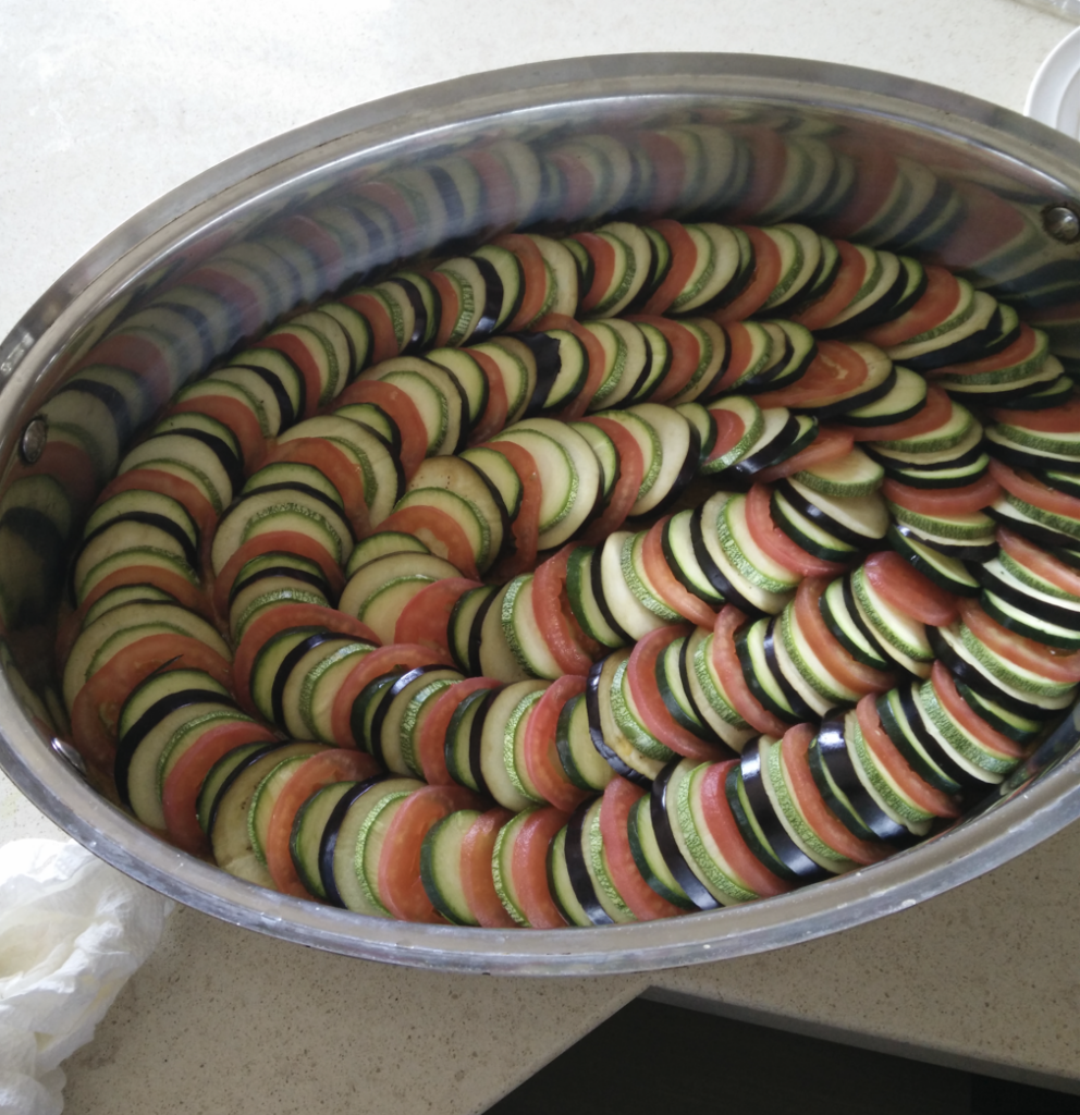Obviously drawing inspiration from the Pixar movie this was a fun recipe that is great for larger celebrations (Easter/Christmas). It is heavily important to ensure that all vegetables are of uniform size which is much easier said then done as finding zucchini, eggplant, tomatoes all in the same size can be difficult. It requires a bit of prep-work but once prepared can be easily baked while working on other things. I have trialled 2 versions, one classic with the typical vegetable and the other an improved modified version with a mix of alternating potatoes and bacon which add a nice taste to the vegetables (bacon>vegetables). To ensure size consistency I slice the vegetables on a mandolin but sometimes have to go by hand.