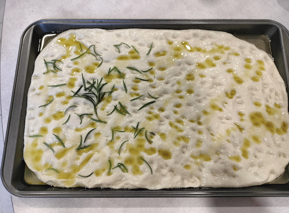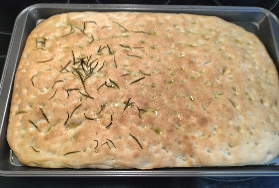 A quick and easy classic rosemary focaccia is staple dish. Not much to note other than the fresh rosemary that add a perfect touch. Great on its own straight out of the oven or with some refreshing toppings.