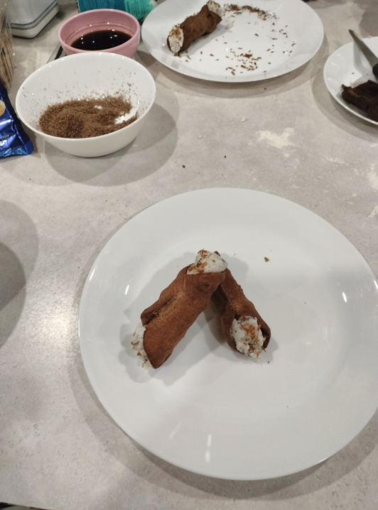 A bit of a laboured dish it provided a fun weekend challenge. The dough was made traditionally with Marsala wine so that it had plenty of bubbles during frying. I also added a bit of cocoa powder to add a different colour to the shells. The filling was made with drained and sweetened ricotta blended both with coconut and chocolate. Lastly the finished cannoli were coated with home toasted coconut shreds.