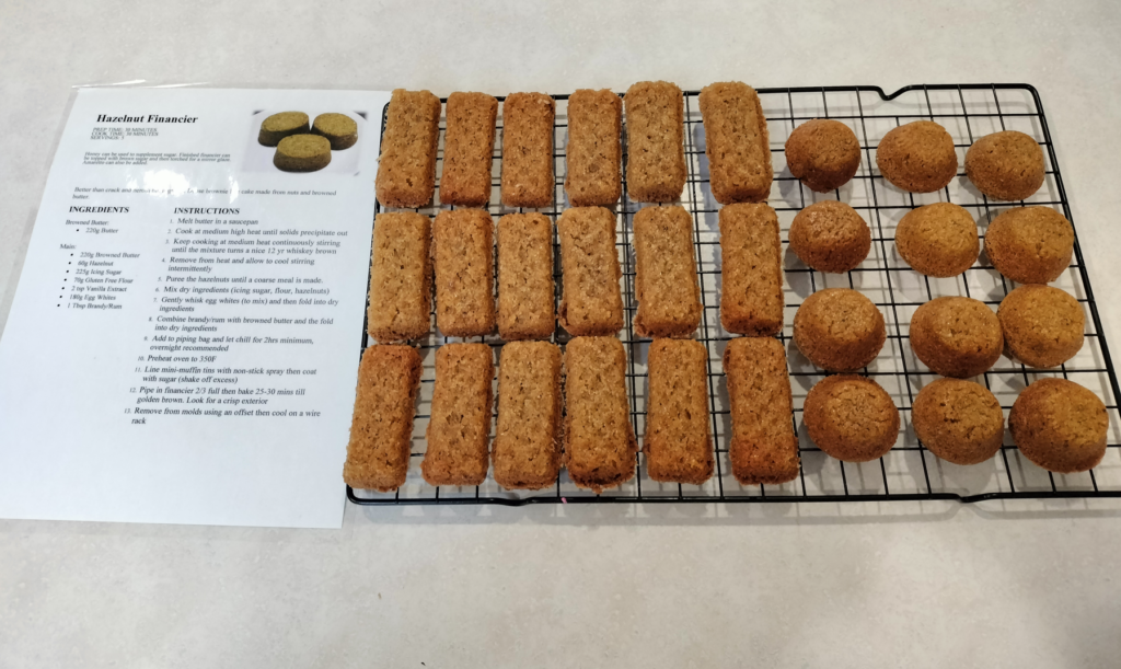 Known as my “Feel Good Cookies” my hazelnut financier are exceedingly addictive. A combination of hazelnut flour and browned butter make this a supercharged nutty explosion. I coat the baking mould with butter and sugar to give it a “sugar glazed” finish. Overall a 10/10 recipe that always makes you feel good.