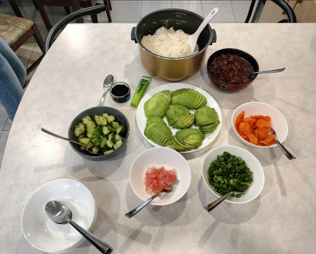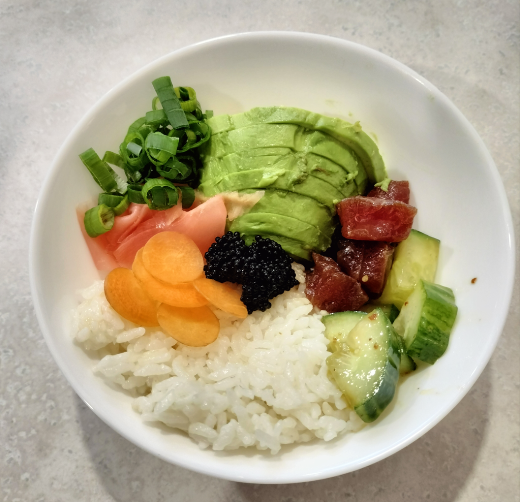 A lovely classic, tuna poke bowls are both incredibly complex and simple at the same time. Tuna was seasoned in a soy/honey marinade (with a bit of ginger, sake, mirin) that makes it pop in the mouth. Spicy cucumbers, avocado and other basic additions as well as some caviar to fancy up the dish. Timeless classic.