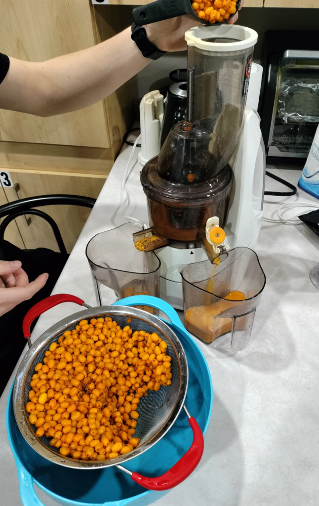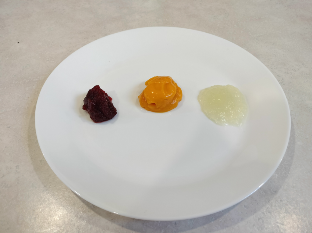 Samples sauce trials with different textures. First from the left is a pomegranate chunky puree which textually is closer to a marmalade. Center is the sea buckthorn which is a more “goopy” texture and right is a thin lime sauce. Different agar concentrations and puree times allowed for the control over the texture of the final product. More agar led to a thicker product and less puree time created a more chunky texture.