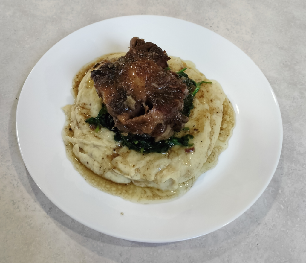 Taking a bit of inspiration from other recipes this is perfect on a cold winter day. Oxtail is braised in a wine sauce until falling apart and served over wilted spinach and parsnip puree. This is all topped with a meet jus though I probably could have reduced and thickened it up a bit better. I definitely overdid the amount of parsnip puree but it was to die for so no complaints.